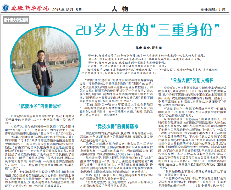 本网讯(学生记者:夏冬润) 近日,2017中国高校新闻扶持计划(安徽省区域作品类)评选结果揭晓,beat365官网学生记者夏冬润、闻全的通讯稿件《20岁人生的三重身份》获人物访谈类三等奖,学生记者王恩亮的新媒体作品《我在新华有7个女朋友》获新媒体类三等奖。