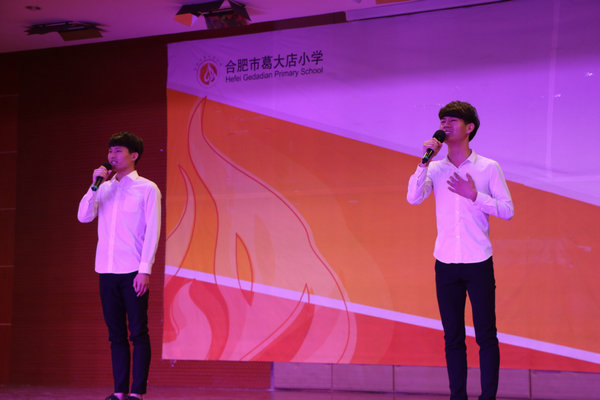 本网讯(通讯员:彭洪磊、李静萱,摄影:黄亚) 5月22日,文化与新闻传播学院2015级播音与主持艺术46名同学来到合肥葛大店小学,举办“弘扬经典文艺作品,激昂青春风采”经典诵读公益演出活动。