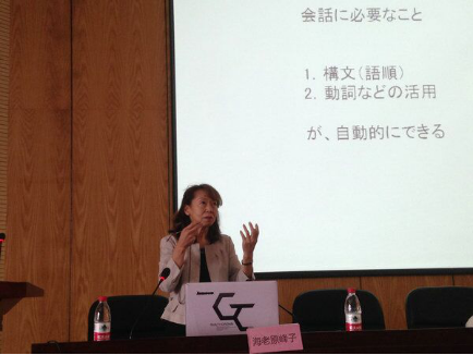 此次交流访问分为课程观摩和教学方法探讨两部分。海老原峰子参加了日语系2016级日语本科基础日语课程示范观摩课,就基础日语课程的教授法、教材中的难点以及学生的学习方法提出了意见和建议;教学方法探讨过程中海老原峰子以常用句型为例,就“如何用地道的日语会话”展开论述。她针对初学者提出了动词速记法,总结了在五十音图的基础上进行动词变形的规律。