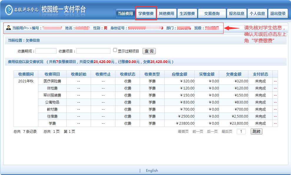 (1) 登录缴费平台后,主界面会显示学费待缴金额;
