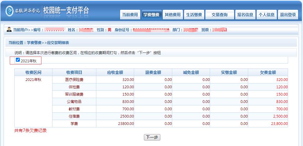 (2)按照说明勾选需要缴费的收费区间“2021年秋”,然后点击“下一步”。(图4)