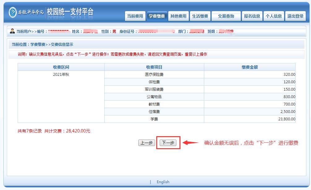 (4) 再次确认缴费信息后点击“下一步”。(图6)