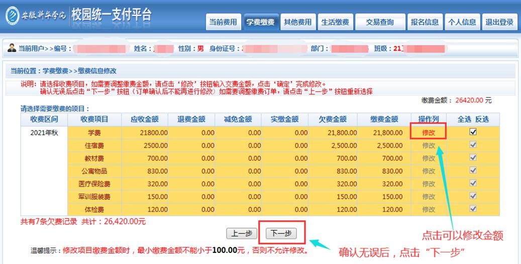 提示:如果申请办理了助学贷款,学费的缴费金额请按照扣除助学贷款后的金额进行修改、缴纳。例如:学费金额为23800元,已办理了8000元的助学贷款,则修改学费金额为15800元(学费23800元-助贷8000元)。缴纳完成后,系统会显示欠学费8000元,这是正常现象,无需进行任何操作,等助学贷款到达学校账户后,该欠费会自动消失。