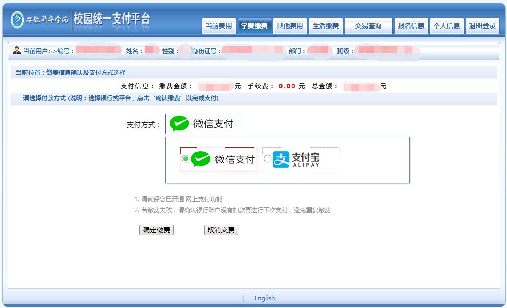 (5) 选择付费方式后,点击“确定缴费”(目前支持微信支付和支付宝两种支付方式)(图7)