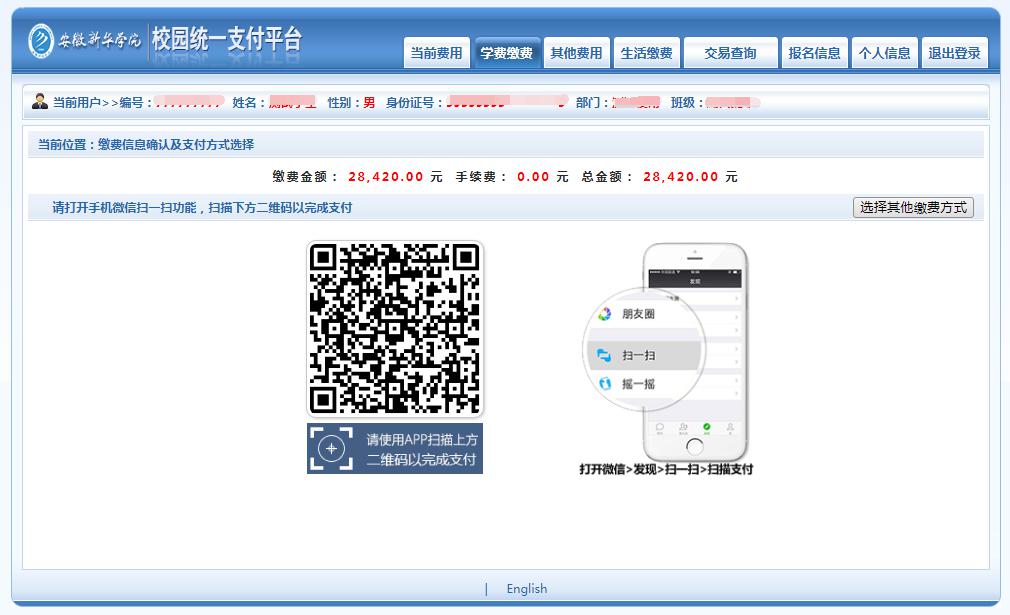 支付宝:手机支付宝扫描“缴费平台”支付宝二维码;