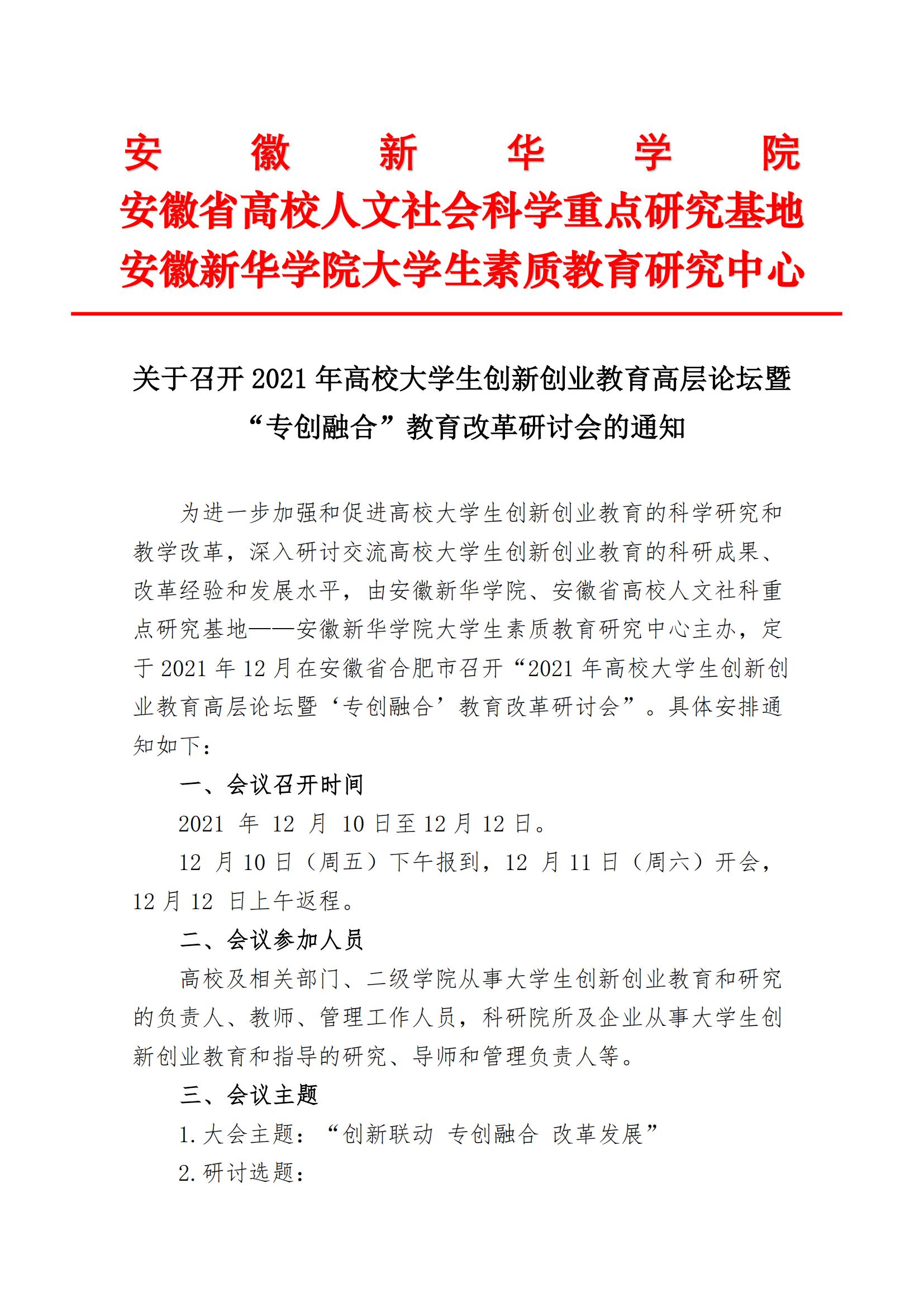 关于召开2021年高校大学生创新创业教育高层论坛暨“专创融合”教育改革研讨会的通知