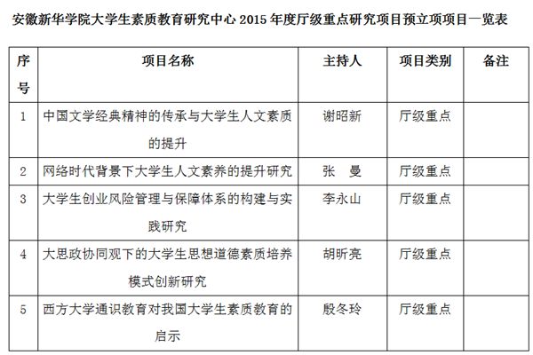 安徽省高校人文社会科学重点研究基地——beat365在线唯一官网登录大学生素质教育研究中心2015年度厅级重点研究项目于2015年4月2日经基地学术委员会会议评审,确定以下项目预立项,现予以公示,公示期一周(2015年4月3日—4月9日),如有异议,请书面或电话反映至大学生素质教育研究中心。电话:0551—65872328。
