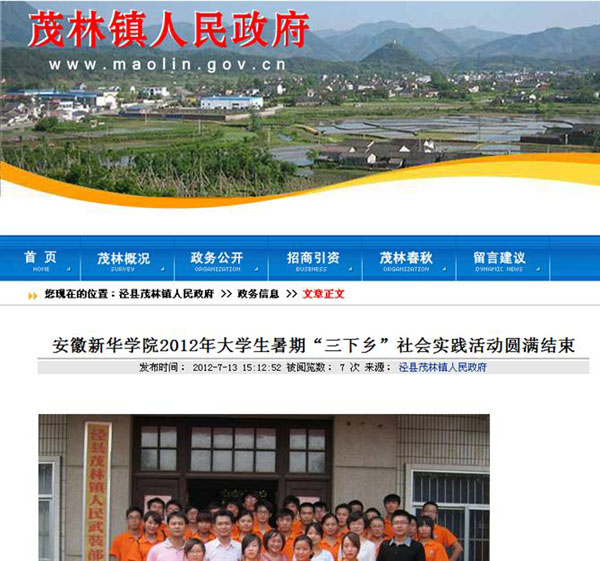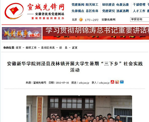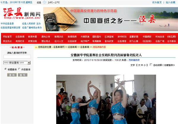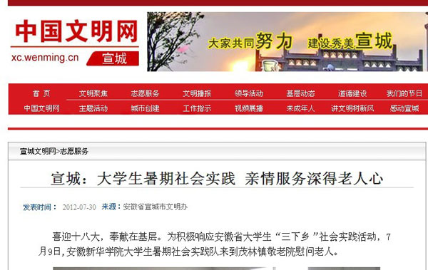 2012暑假,beat365官网大学生赴老区泾县茂林镇社会实践活动在当地引起了强烈反响。近日,“中国文明网”以专题形式重点报道了实践队开展的关爱孤寡老人活动,并给与了高度评价。
