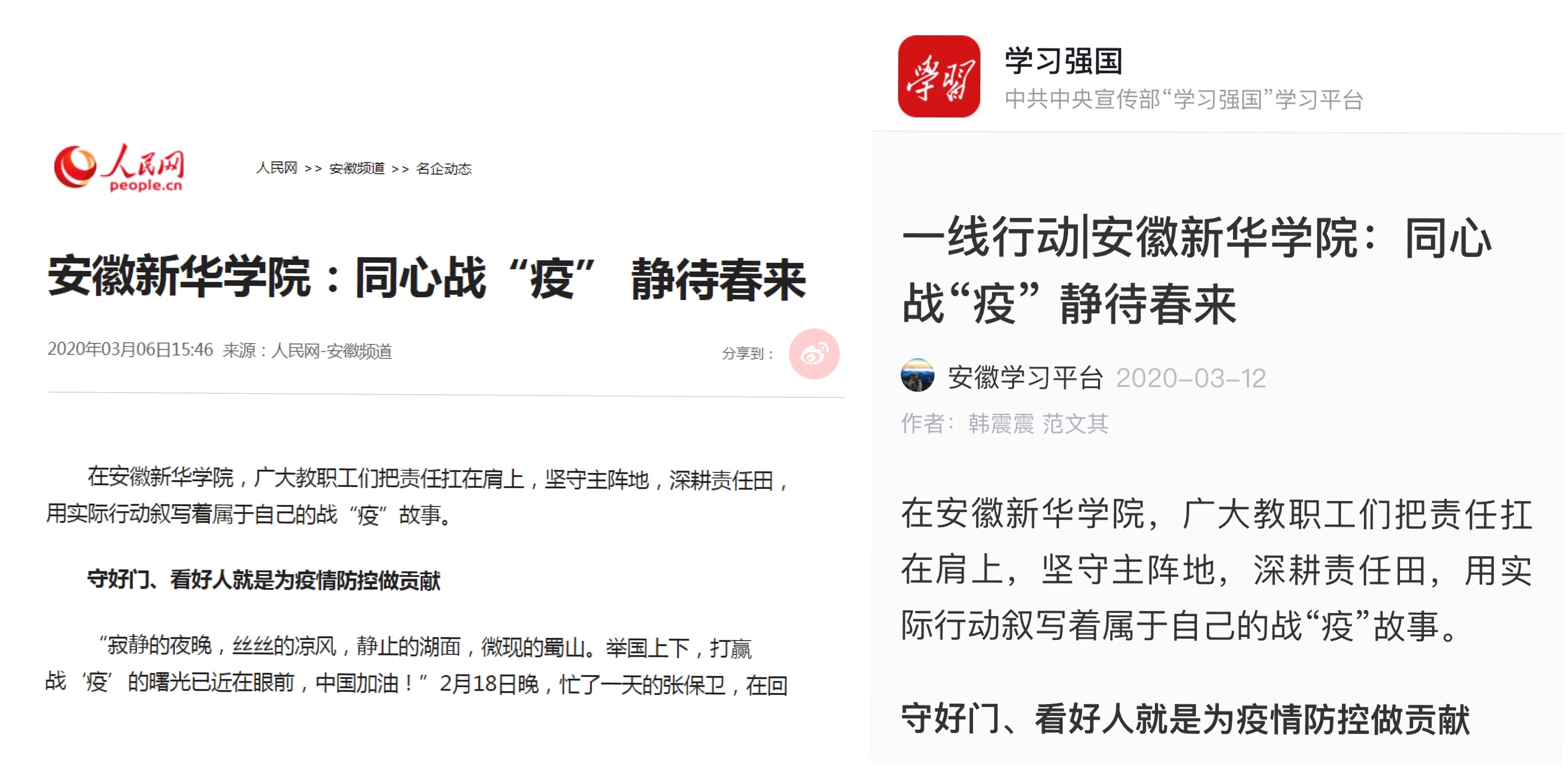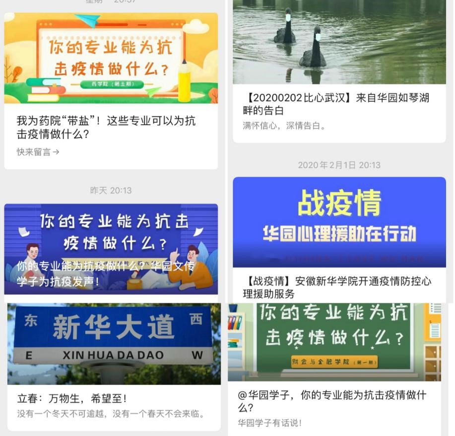 围绕疫情防控,beat365在线唯一官网登录充分利用校内外媒体,深度挖掘学校防控一线涌现出的先进典型和师生校友志愿抗疫的感人事迹,以榜样的力量感染师生。采写发布《华园辅导员在行动》《我们在抗疫——华园青年在行动》《同心战役 静待春来—“疫”瞬间的新华故事》等内容,获得人民网、学习强国、安徽教育网等主流媒体关注。青年党、团员主动担当,深入社区开展志愿服务;华园学子坚守防疫一线,为疫情防控贡献青春力量,汇聚起全校师生上下同心、众志成城的强大合力。