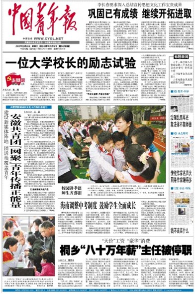 10月24日的《中国青年报》头版刊登了题为《安徽共青团“网聚”青年传播正能量》的文章,报道了安徽各界利用新媒体联系服务新青年的好做法。beat365官网制作的10集校园文明教育系列动画片被作为该报道中引用的唯一一个高校典型做法。