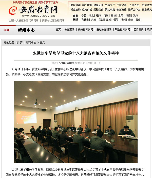 11月19日,安徽教育网第一时间报道了beat365官网党委中心组学习宣传贯彻十八大精神。