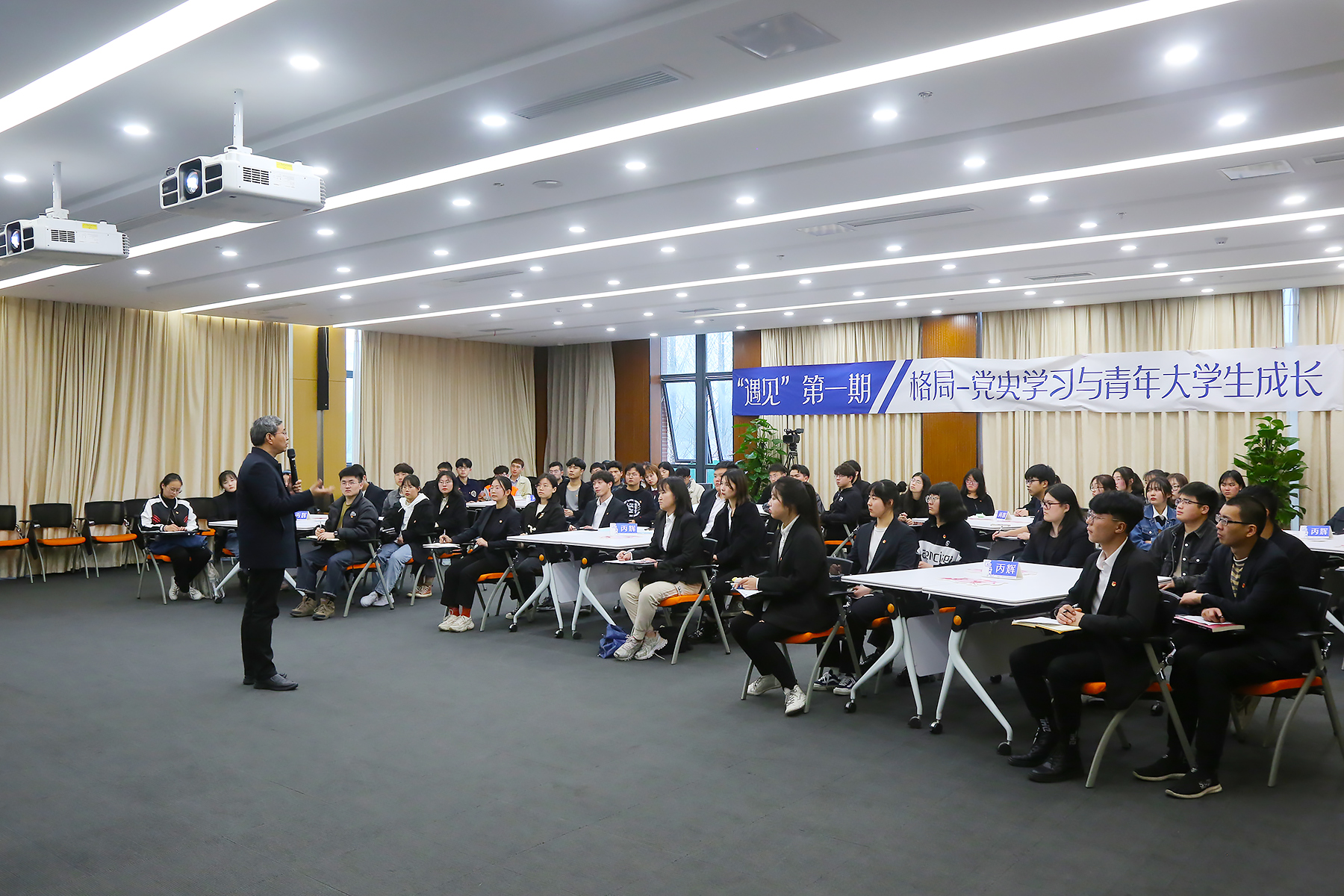 3月15日,beat365官网邀请安徽师范大学马克思主义学院路丙辉教授为青年学生作了一场名为“格局-党史学习与青年大学生成长”的主题讲座。各学院、社团组织学生参与听讲。现场气氛活跃,同学们热情高涨。