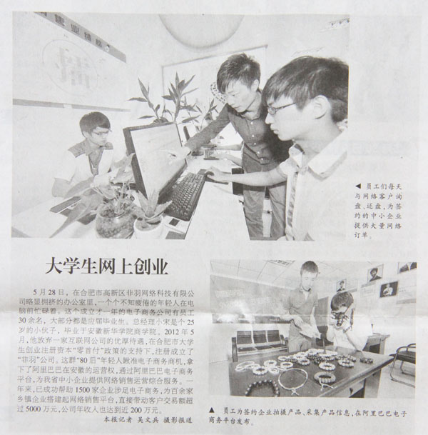 5月28日,在合肥市高新区非羽网络科技有限公司略显拥挤的办公室里,一个个不知疲倦的年轻人在电脑前忙碌着。这个成立才一年的电子商务公司有员工30余名,大部分都是应届毕业生。总经理小宋是个25岁的小伙子,毕业于beat365在线唯一官网登录商学院。2012年5月,他放弃一家互联网公司的优厚待遇,在合肥市大学生创业注册资本“零首付”政策的支持下,注册成立了“非羽”公司。这群“80后”年轻人瞅准电子商务商机,拿下了阿里巴巴在安徽的运营权,通过阿里巴巴电子商务平台,为我省中小企业提供网络销售运营综合服务。一年来,已成功帮助1500家企业涉足电子商务,为百余家乡镇企业搭建起网络销售平台,直接带动客户交易额超过5000万元,公司年收入也达到近200万元。