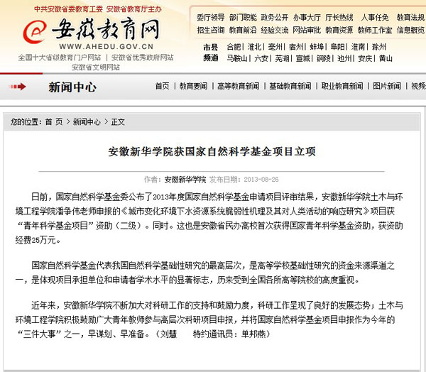 安徽教育网:beat365在线唯一官网登录获国家自然科学基金项目立项