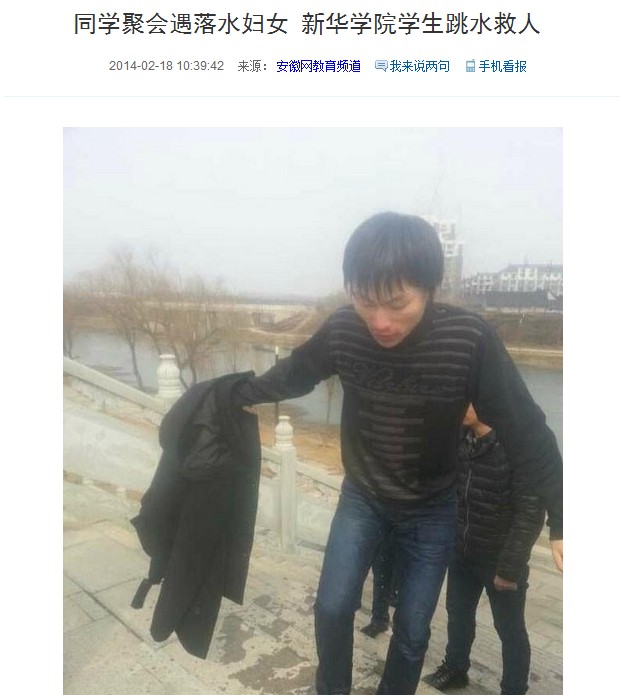 安徽网:同学聚会遇落水妇女 新华学院学生跳水救人
