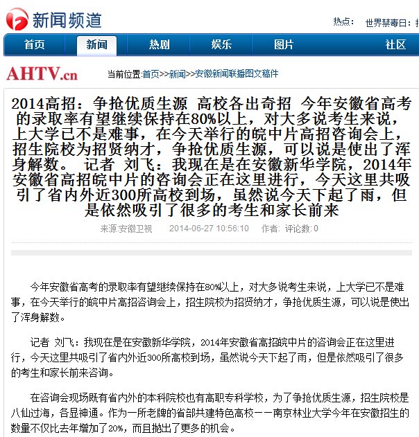 安徽卫视:2014高招——争抢优质生源 高校各出奇招