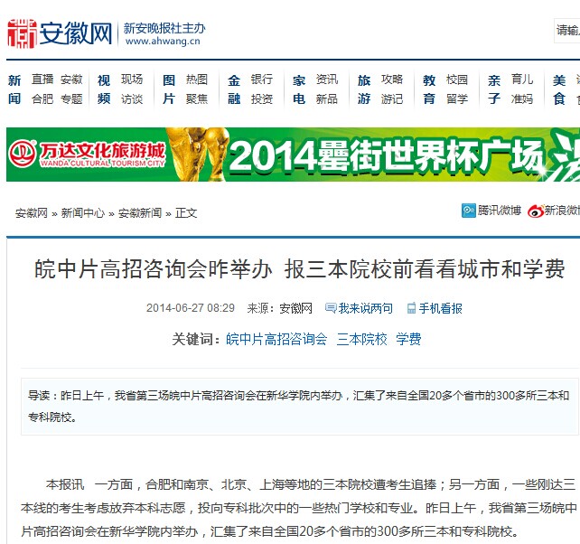 安徽网:皖中片高招咨询会昨举办 报三本院校前看看城市和学费
