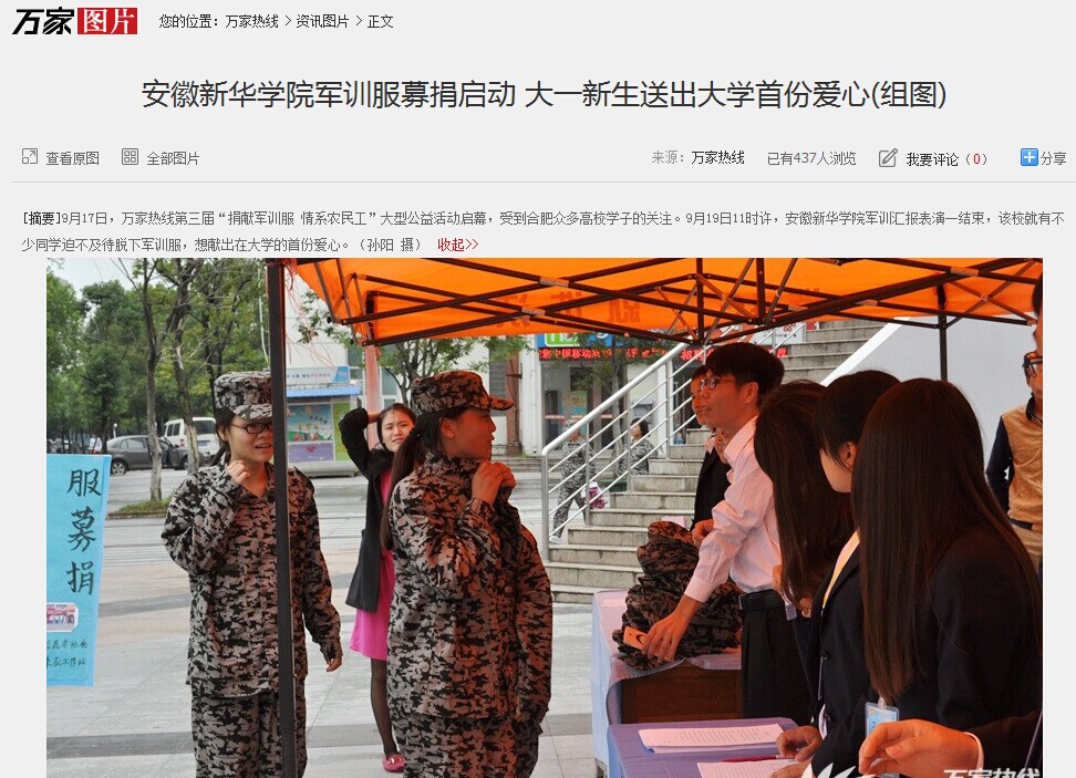 万家热线:beat365在线唯一官网登录军训服募捐启动 大一新生送出大学首份爱心