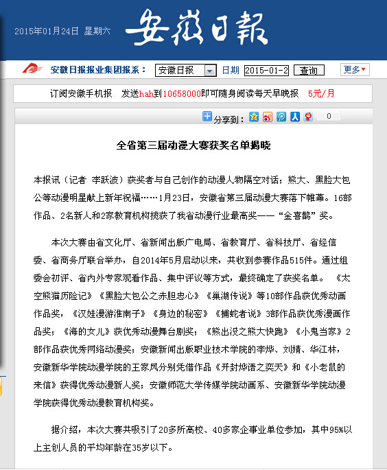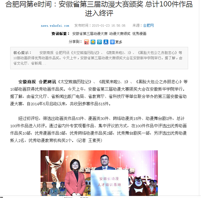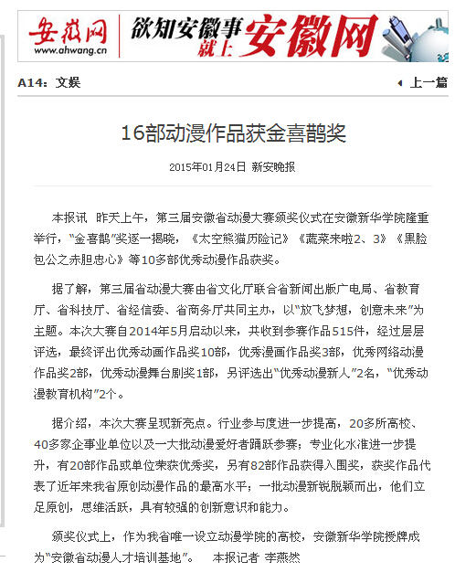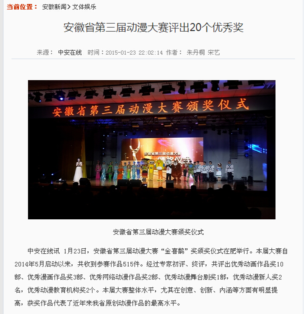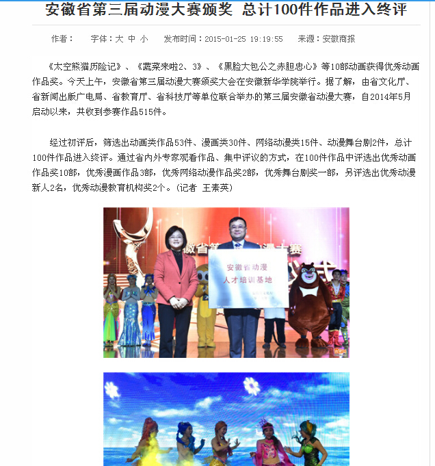 安徽日报、新安晚报、安徽商报、中安在线报道beat365官网承办安徽省第三届动漫大赛“金喜鹊”颁奖仪式