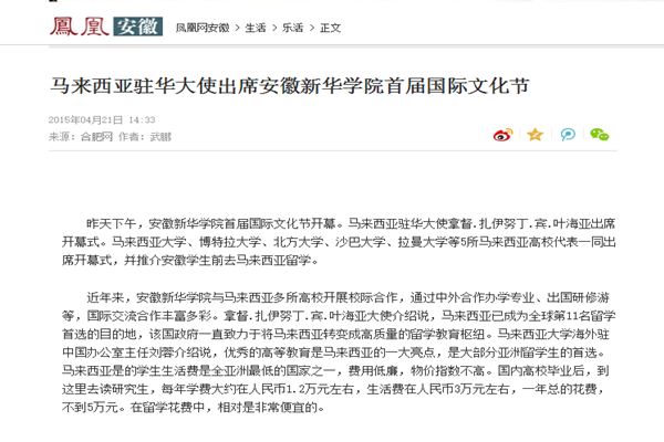 凤凰安徽:马来西亚驻华大使出席beat365在线唯一官网登录首届国际文化节、马来西亚五所名高校来皖揽学子 驻华大使助阵