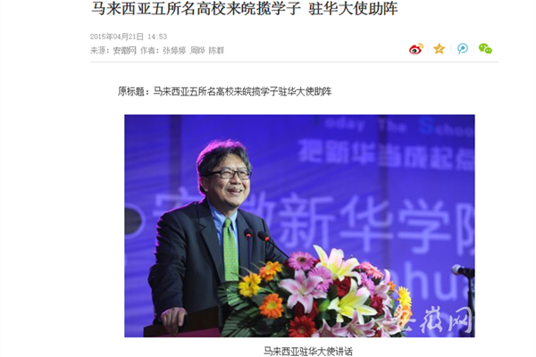 据了解,该交流活动由安徽省教育厅组织。教育厅外事处介绍,4月20—21日,马来西亚驻华大使和马来西亚五所名高校将在安徽几所高校交流,“我们通过这样的组织,希望加强安徽各高校与马来西亚等高校之间的交流学习,能够相互推荐优秀学子来留学。”