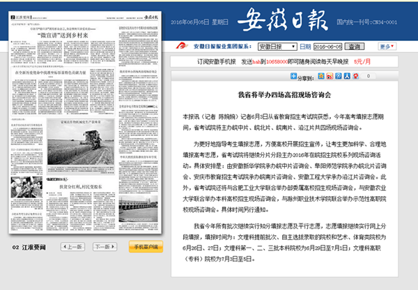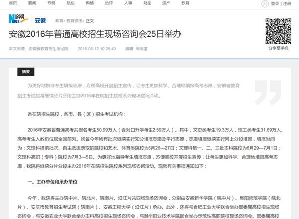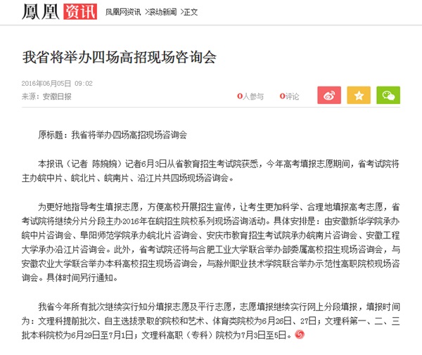 安徽日报、凤凰资讯、新华网安徽:我省将举办四场高招现场咨询会