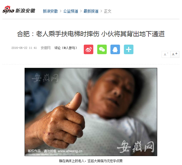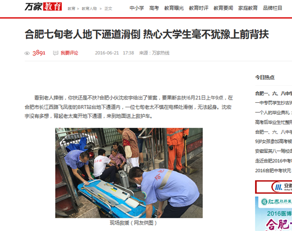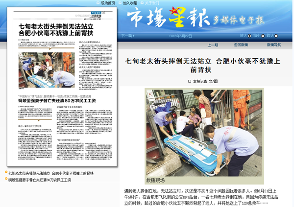 新安晚报、市场星报、今日头条、东方头条、凤凰资讯、新浪安徽、万家热线等20余家媒体:七旬老太街头摔倒无法站立 合肥小伙毫不犹豫上前背扶