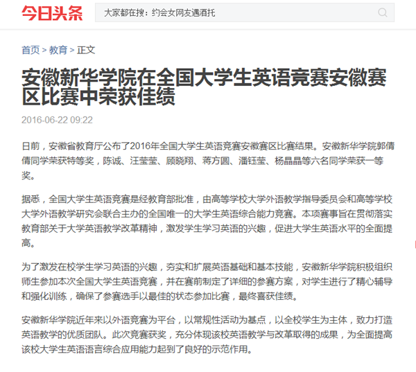 中国教育在线、今日头条、万家热线:beat365在线唯一官网登录在2016年全国大学生英语竞赛安徽赛区比赛中荣获佳绩
