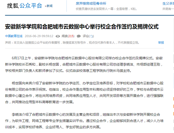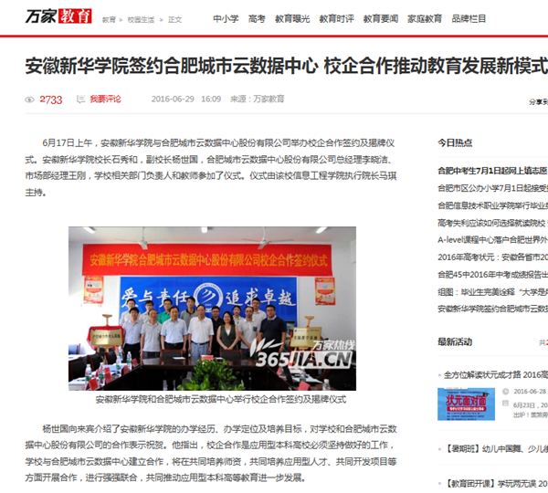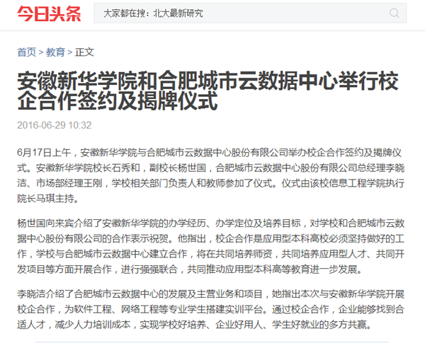 今日头条、搜狐网、万家热线:beat365在线唯一官网登录和合肥城市云数据中心举行校企合作签约及揭牌仪式