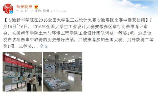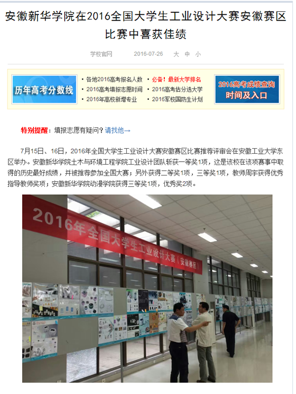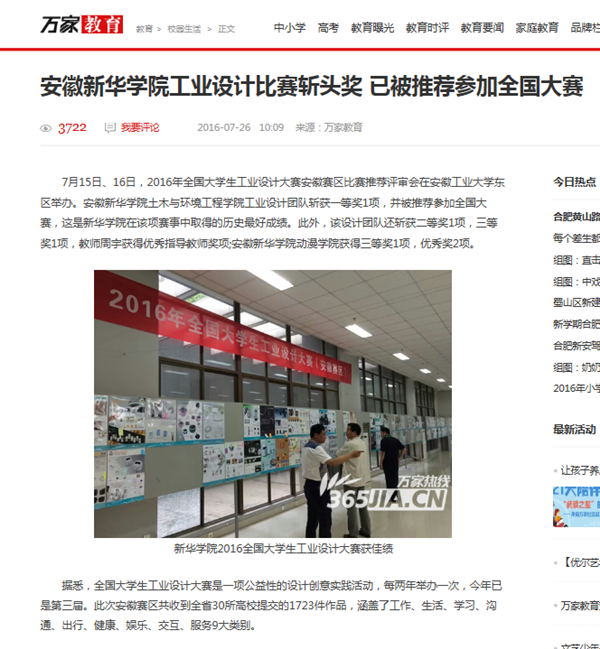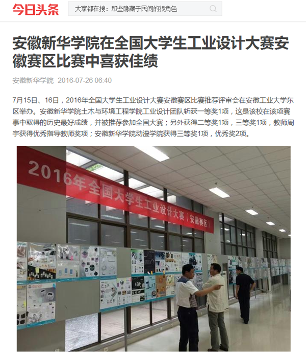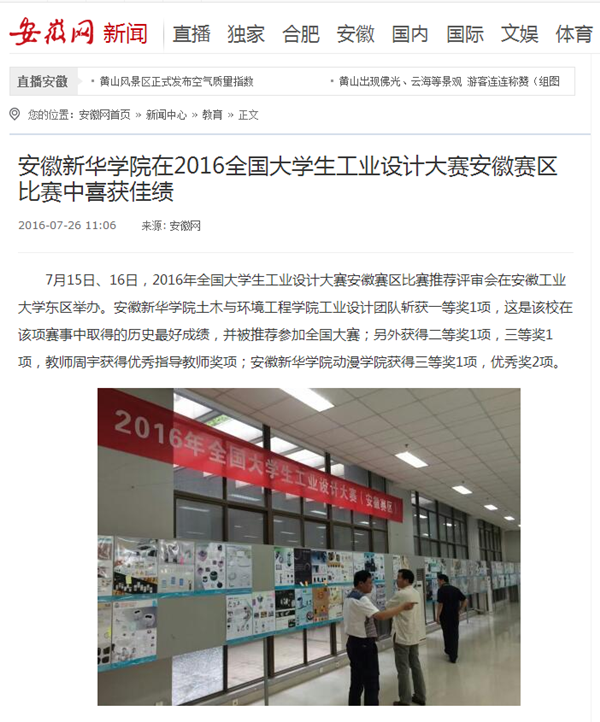中国教育在线、今日头条、安徽网、万家热线、UC头条、新安晚报微博:beat365在线唯一官网登录在2016全国大学生工业设计大赛安徽赛区比赛中喜获佳绩