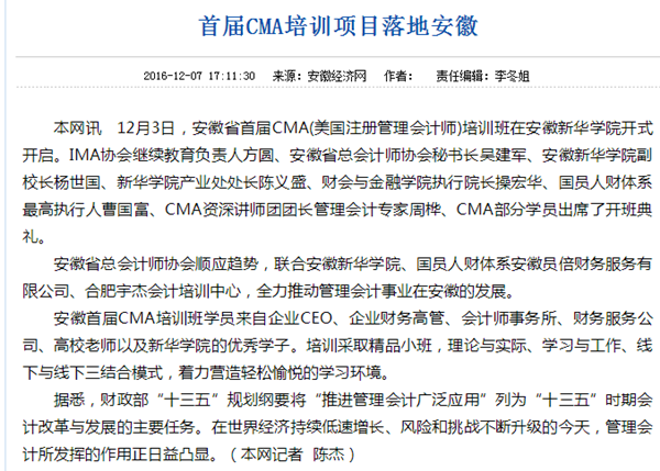 安徽经济网:首届CMA培训项目落地安徽