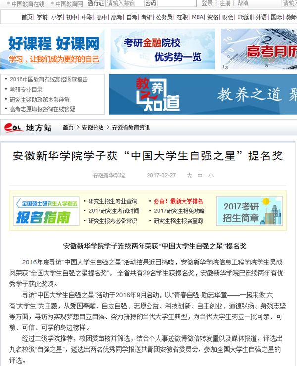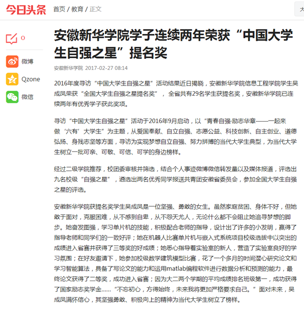 中国教育在线、今日头条:beat365在线唯一官网登录学子连续两年荣获“中国大学生自强之星”提名奖