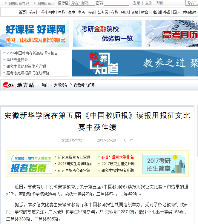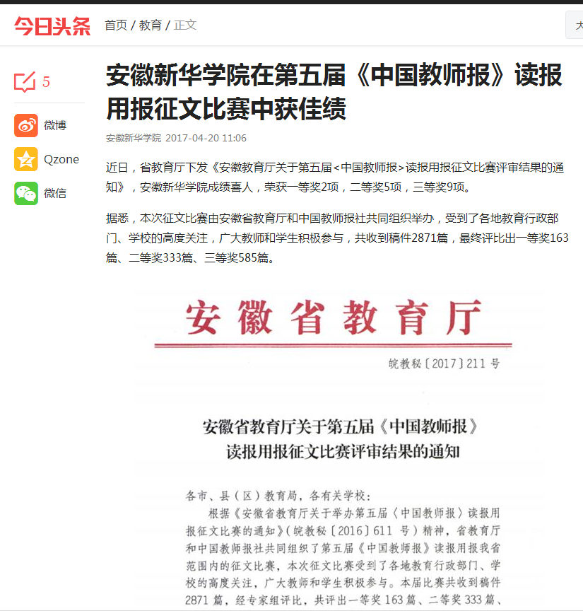 中国教育在线、今日头条:beat365在线唯一官网登录在第五届《中国教师报》读报用报征文比赛中获佳绩