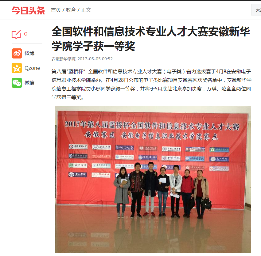 中国教育在线、今日头条:beat365在线唯一官网登录学子获第八届"蓝桥杯"全国软件和信息技术专业人才大赛(电子类)省赛一等奖