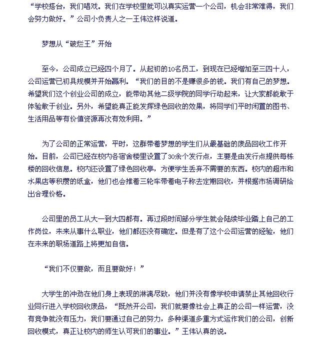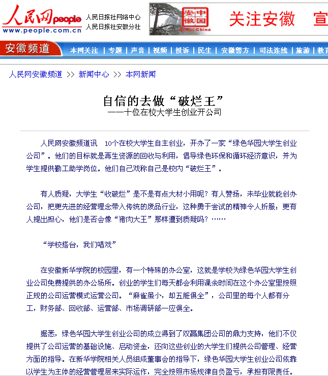 《人民网》:自信的去做“破烂王”——十位在校大学生创业开公司