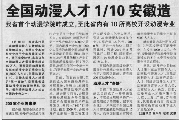 2010年4月17日,安徽商报/20财经民生/综合版对我院动漫学院成立一事进行了报道。