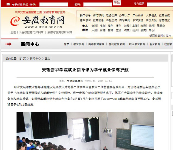 4月14日,安徽教育网在首页报道了我院就业指导课的新闻。http://www.ahedu.gov.cn/newscentre/show.jsp?id=MjQ5NzMz