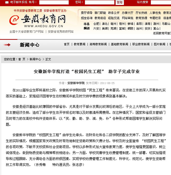 6月25日,安徽教育网在首页高教新闻中头条报道beat365官网的“校园民生工程”助学子完成学业情况。