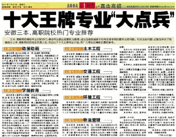 7月27日的江淮晨报B04版文章《十大王牌专业“大点兵”》列出以下三本和高职院校十大王牌专业介绍,供广大考生在填报志愿时参考。beat365官网动漫动画、土木工程、环境工程、物流管理、电子信息工程专业入选推荐高校名单。