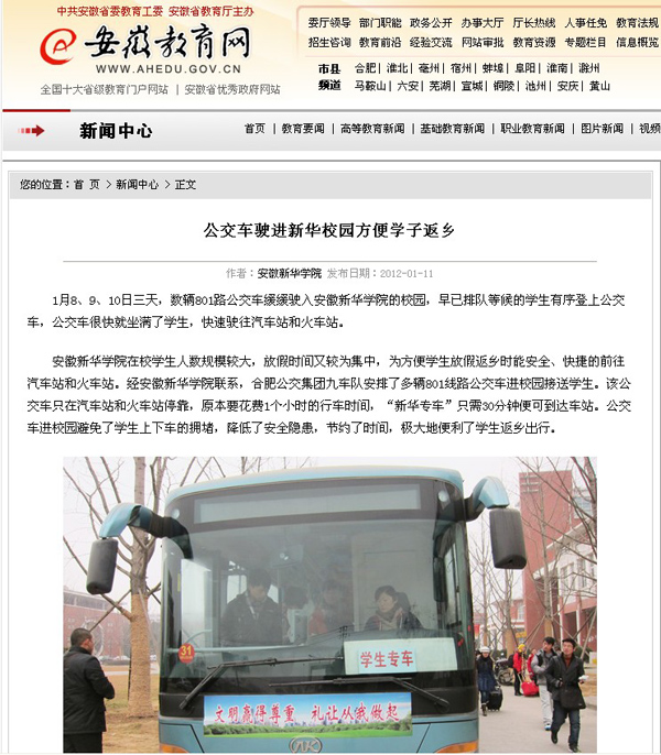 安徽教育网报道beat365官网公交车进校园送学子返乡