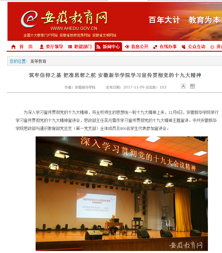 安徽教育网:筑牢信仰之基 把准思想之舵 beat365在线唯一官网登录学习宣传贯彻党的十九大精神