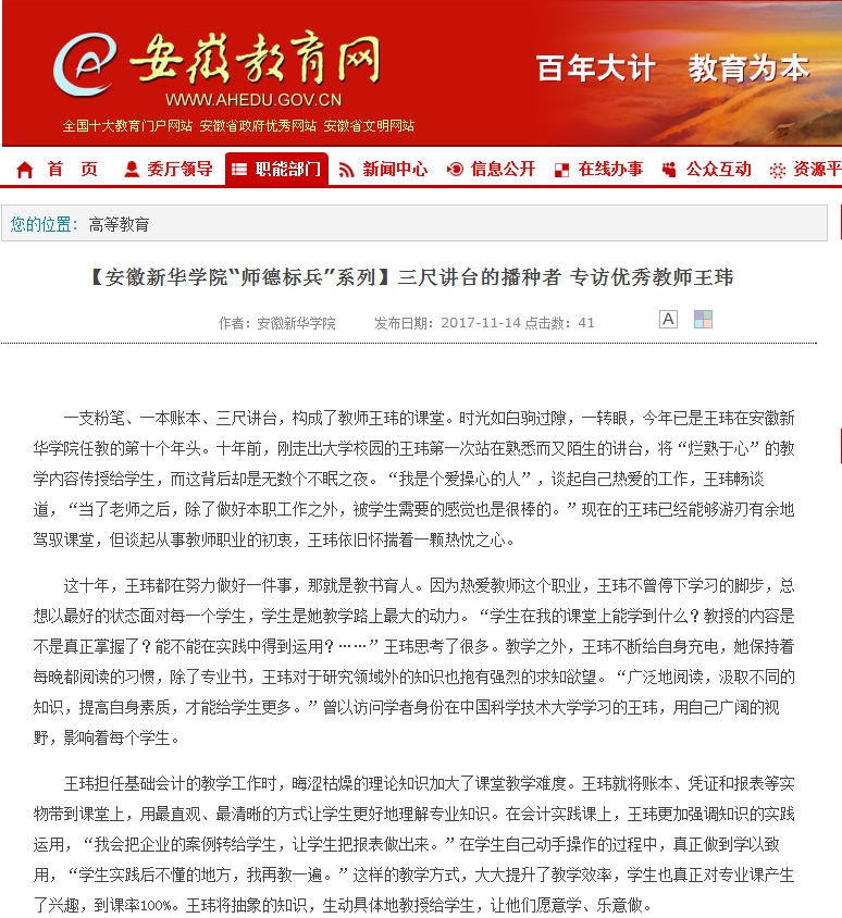 安徽教育网:【beat365在线唯一官网登录“师德标兵”系列】三尺讲台的播种者 专访优秀教师王玮