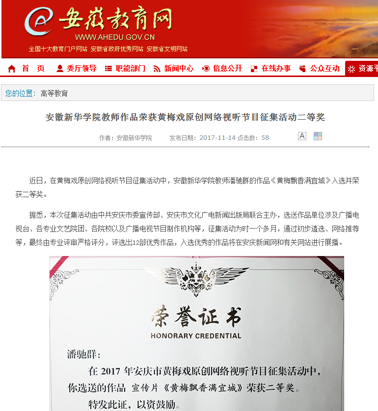 安徽教育网:beat365在线唯一官网登录教师作品荣获黄梅戏原创网络视听节目征集活动二等奖