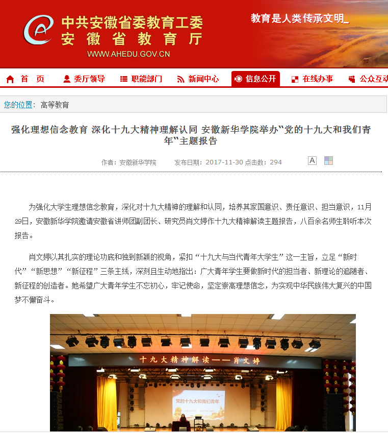 安徽教育网:强化理想信念教育 深化十九大精神理解认同 beat365在线唯一官网登录举办“党的十九大和我们青年“主题报告