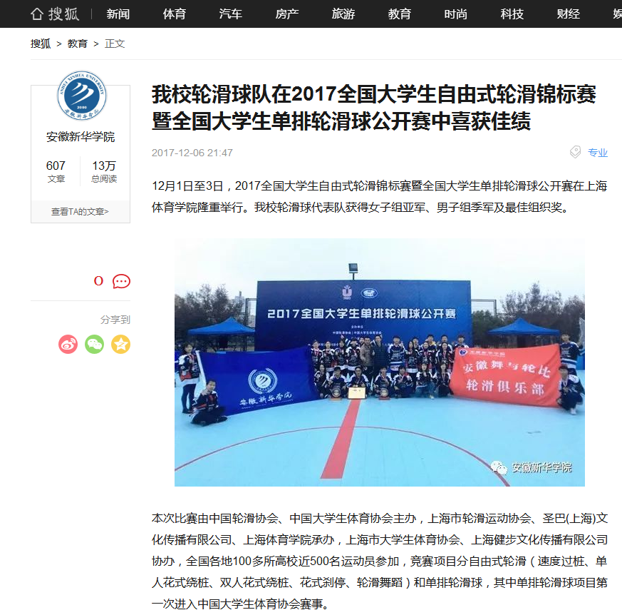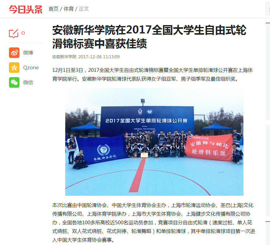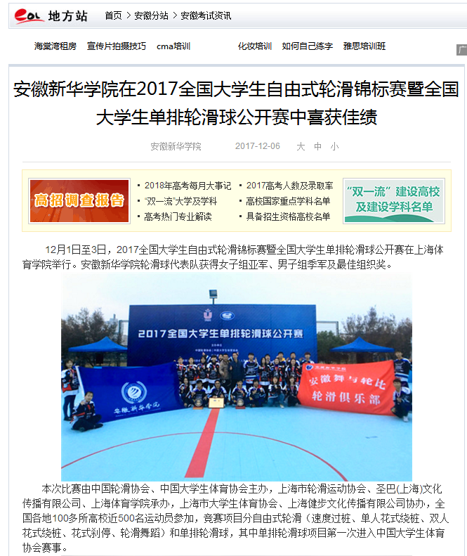 中国教育在线、凤凰网安徽、今日头条、搜狐网: beat365在线唯一官网登录在2017全国大学生自由式轮滑锦标赛暨全国大学生单排轮滑球公开赛中喜获佳绩