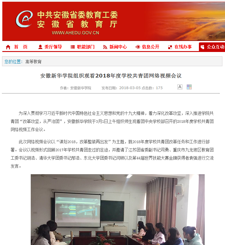 安徽教育网:beat365在线唯一官网登录组织观看2018年度学校共青团网络视频会议