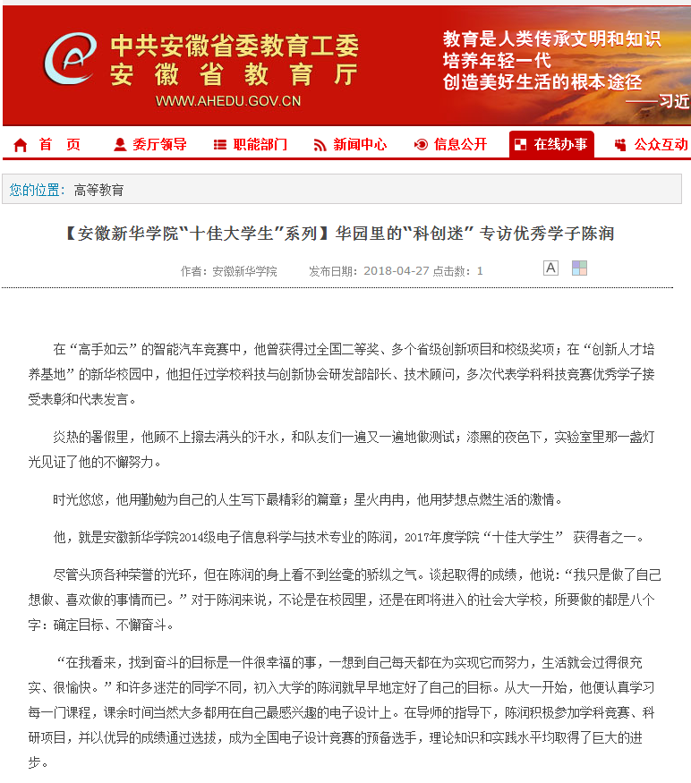 安徽教育网:【beat365在线唯一官网登录“十佳大学生”系列】华园里的“科创迷” 专访优秀学子陈润