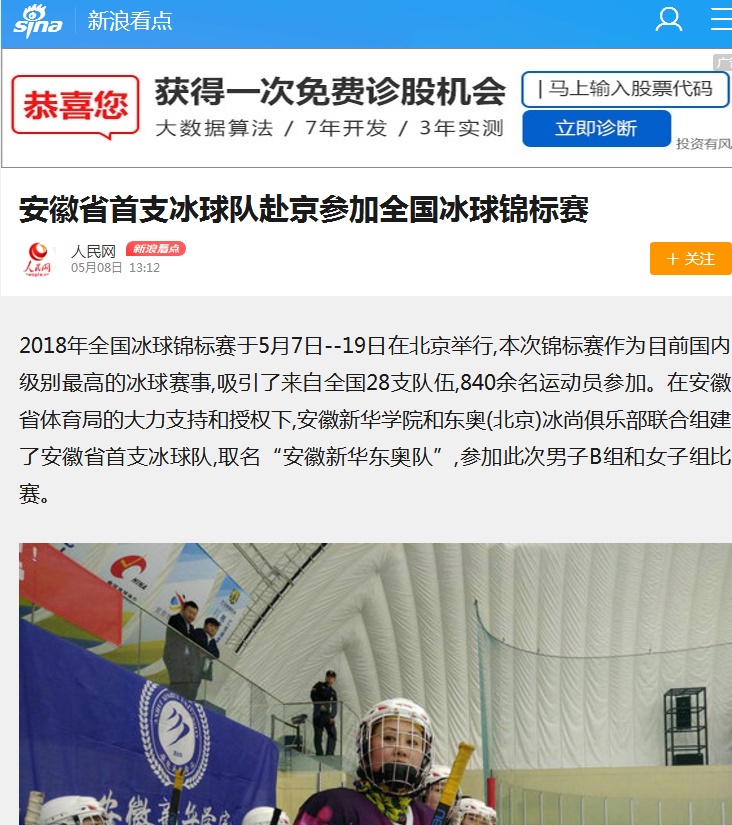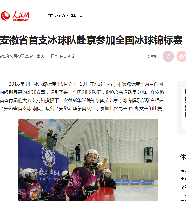 人民网、东方体育新闻、强国论坛、今日头条、搜狐网、新浪看点:安徽省首支冰球队赴京参加全国冰球锦标赛